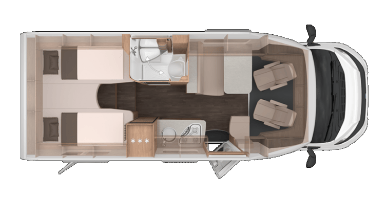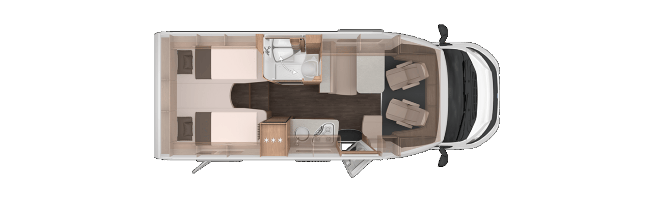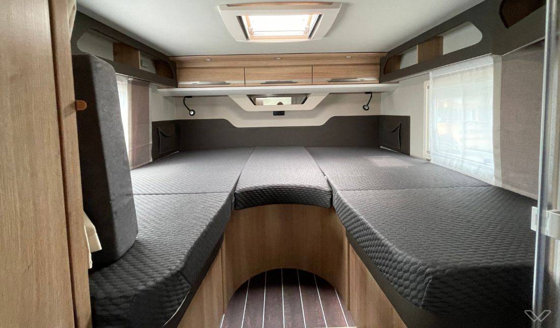 Exklusive Schlafhygiene: Im Heck findest du zwei feste, einzeln beheizte und hinterlüftete Einzelbetten (200 x 78 cm / 194 x 78 cm), die sich zu einer großen Liegewiese verbinden lassen. Die Lounge bietet bei Bedarf Platz für ein drittes Schlafbett (209 x 102/57 cm).