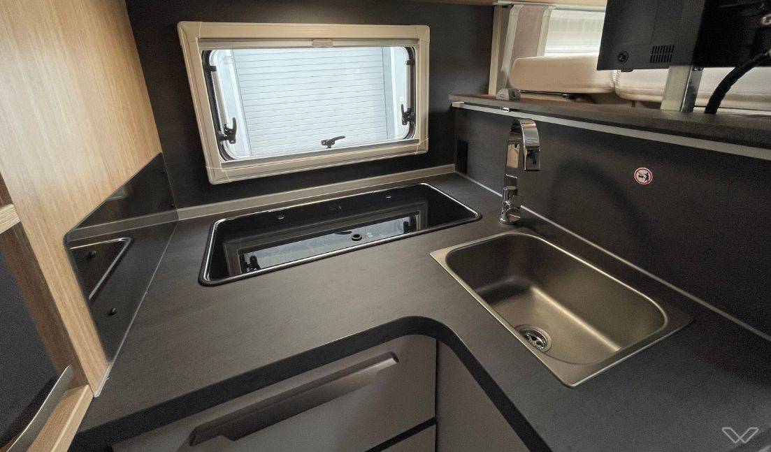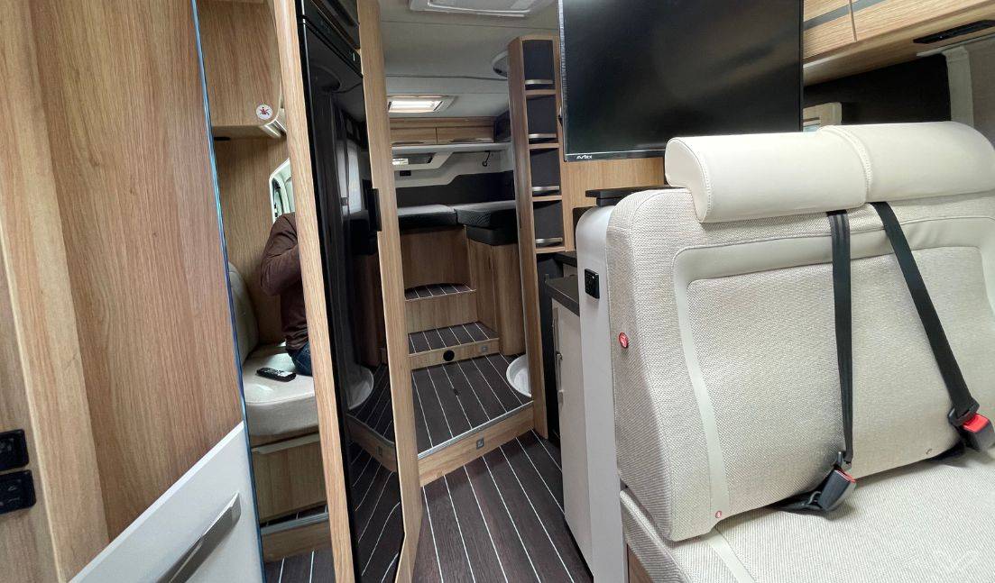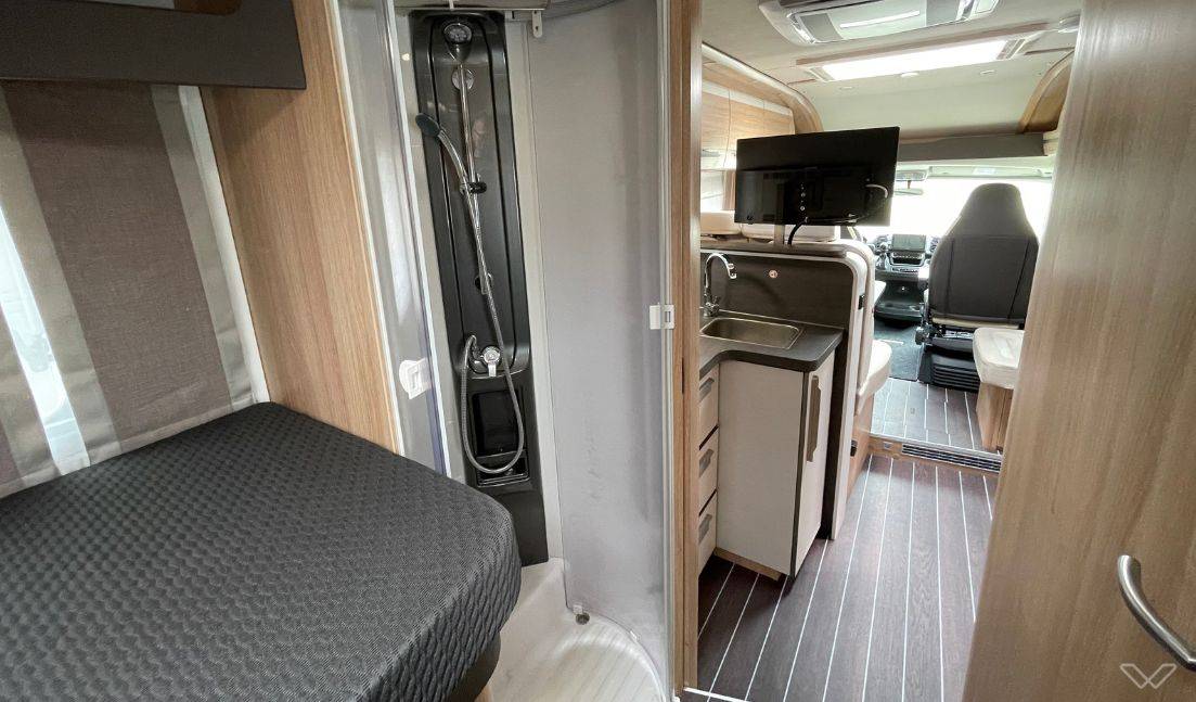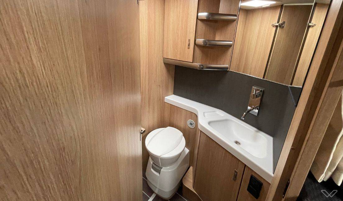 Separates Luxus-Bad: Das Fahrzeug verfügt über ein vollwertiges Badezimmer mit separater Duschkabine und einer drehbaren elektrischen Kassetten-Toilette.