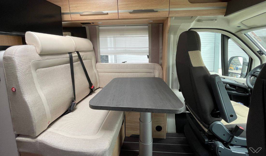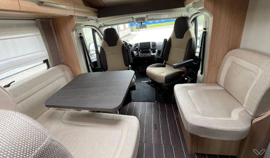 Großzügige Lounge: Die L-förmige Sitzgruppe mit Teleskop-Einsäulenhubtisch und drehbaren Pilotensitzen schafft einen eleganten und gemütlichen Wohnbereich.