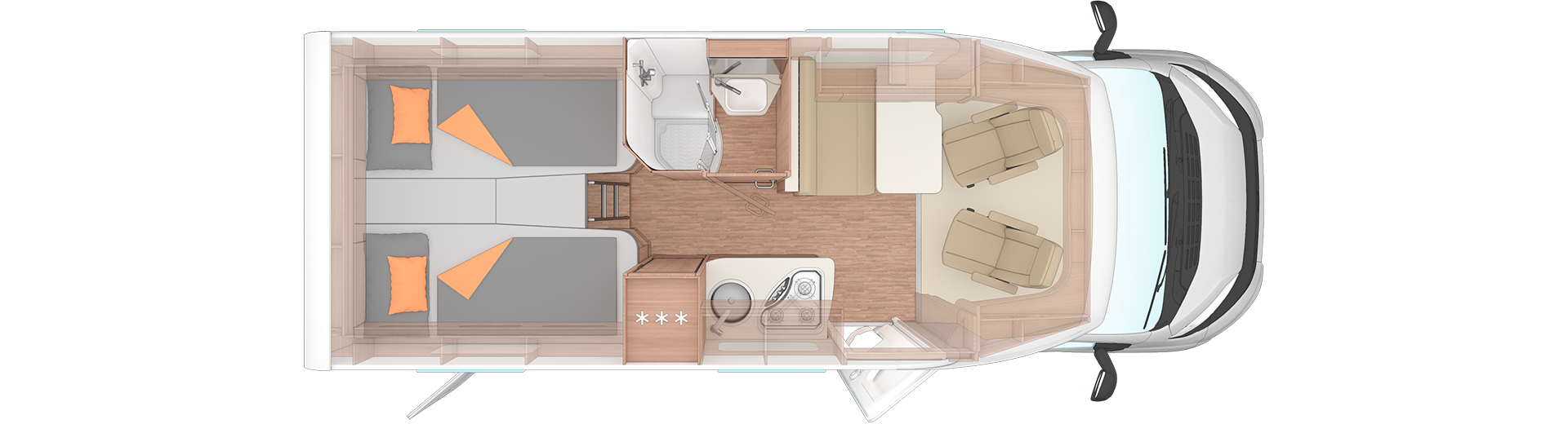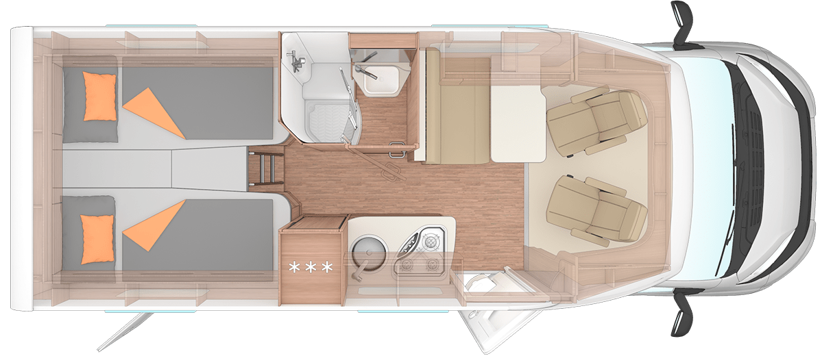 Zwei feste Einzelbetten: Im Heck findest du zwei separate Einzelbetten (je 200 x 82 cm), die eine unkomplizierte Schlafgelegenheit für zwei Personen bieten.