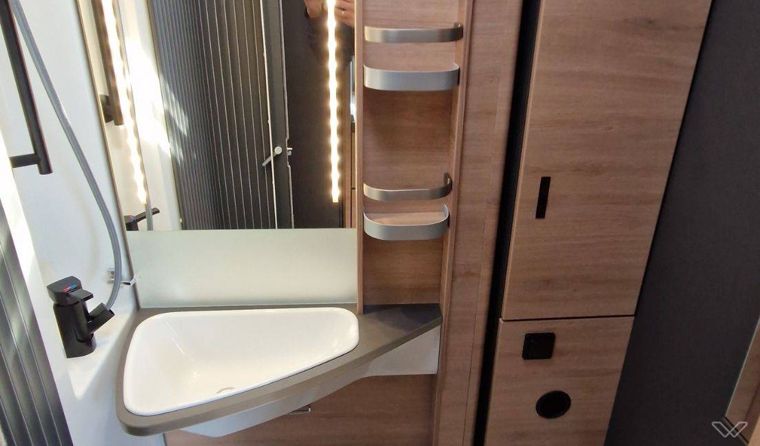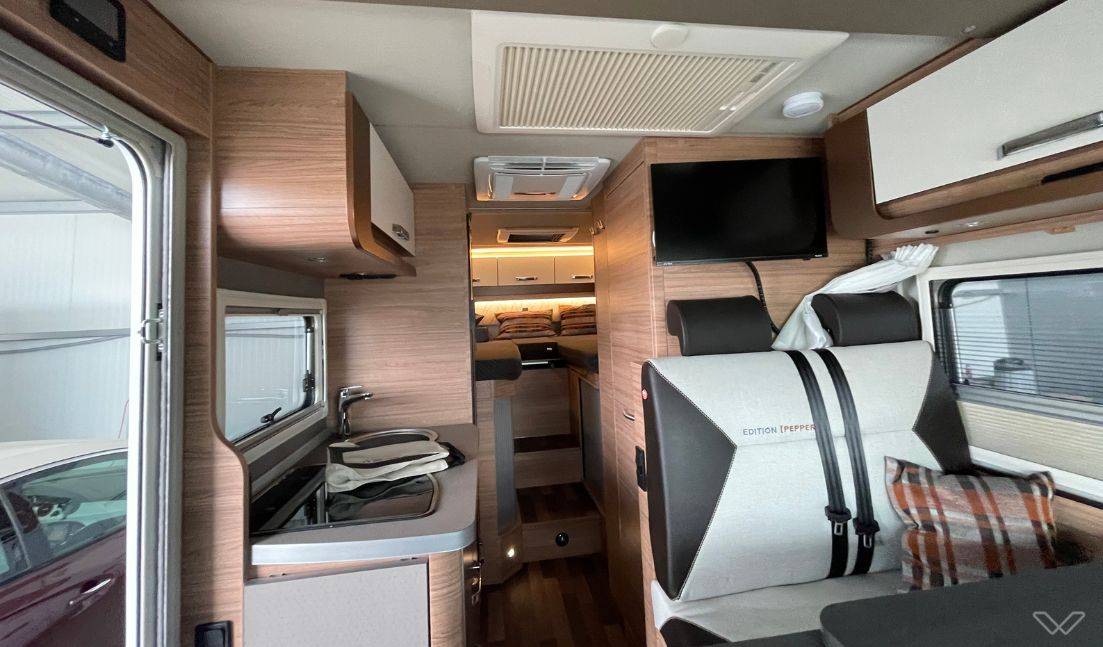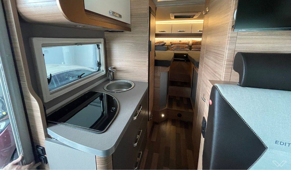 Voll ausgestattete Stehküche: Die Küche verfügt über ein Dreifach-Gaskochfeld mit Glasabdeckung, ein großes Edelstahlspülbecken und einen 142-Liter-Kühlschrank mit automatischer Energiewahl (AES), der auch unabhängig von der 230V-Versorgung arbeitet.