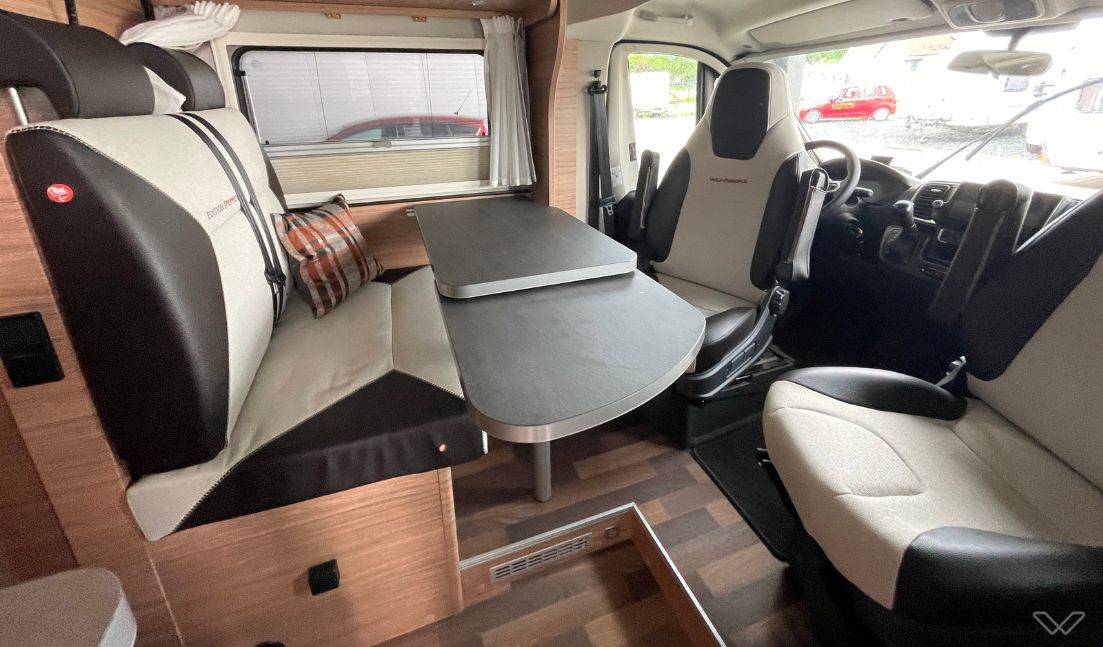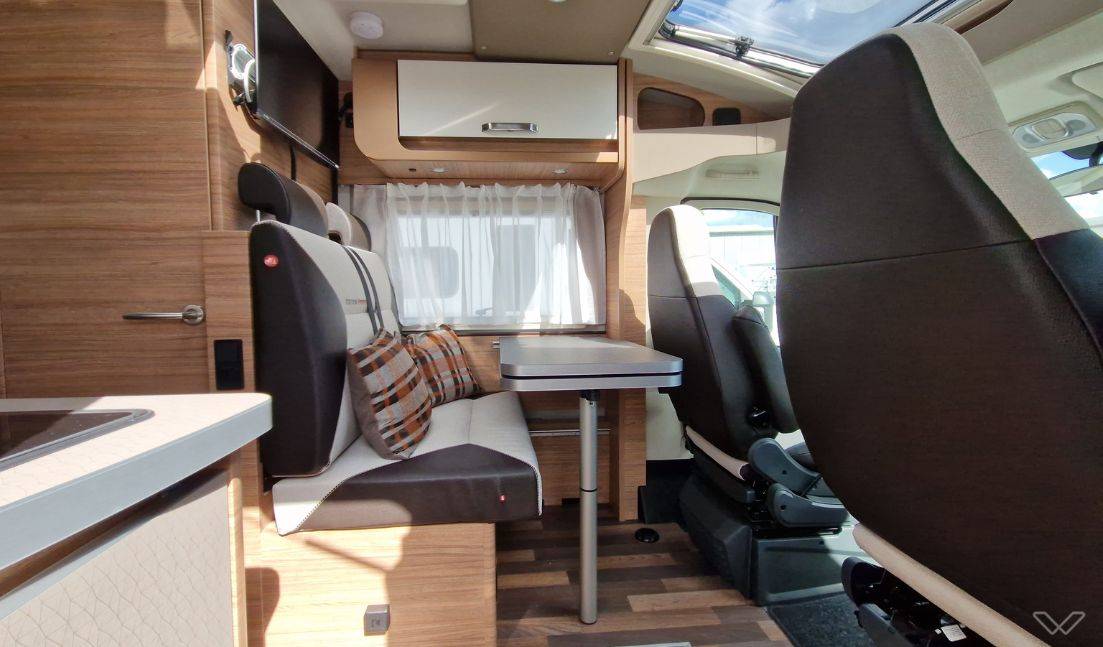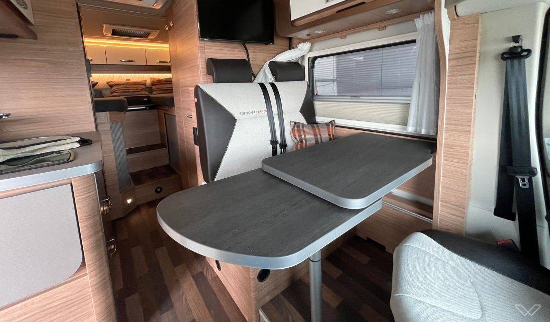 Flexible Sitzgruppe: Die Monositzgruppe mit ausziehbarer Tischplatte und drehbaren Fahrersitzen schafft einen gemütlichen Aufenthaltsbereich, den du auch in eine große Liegefläche verwandeln kannst.