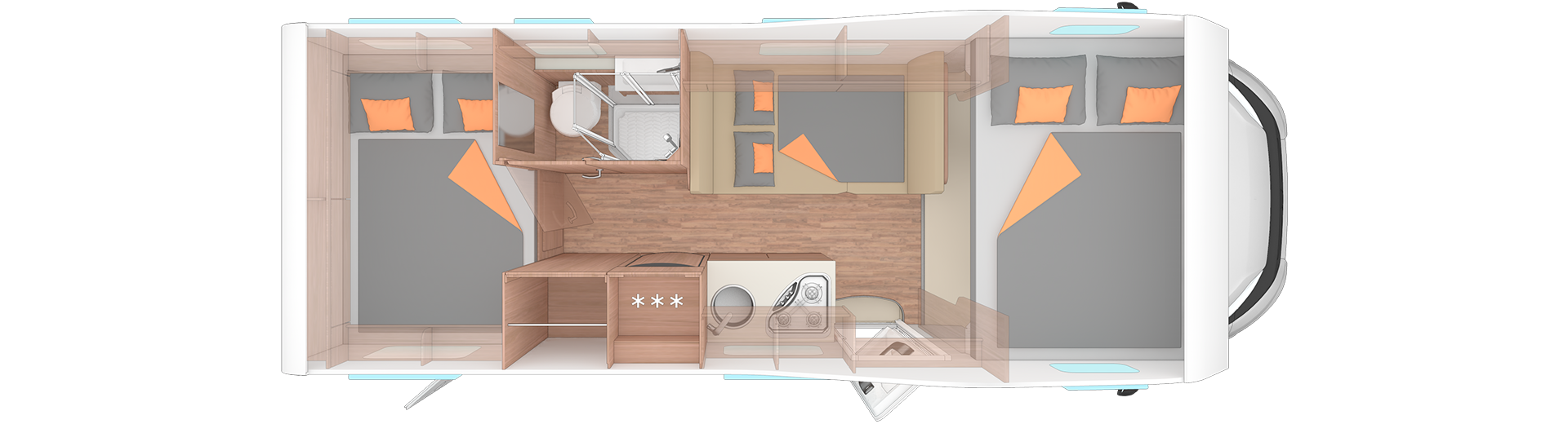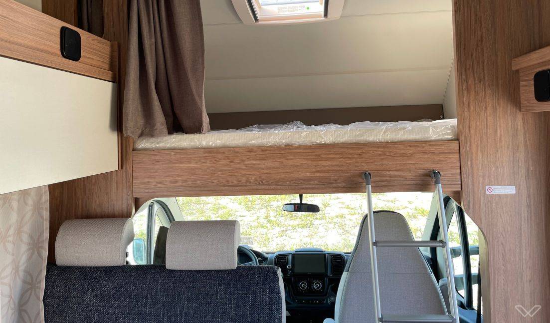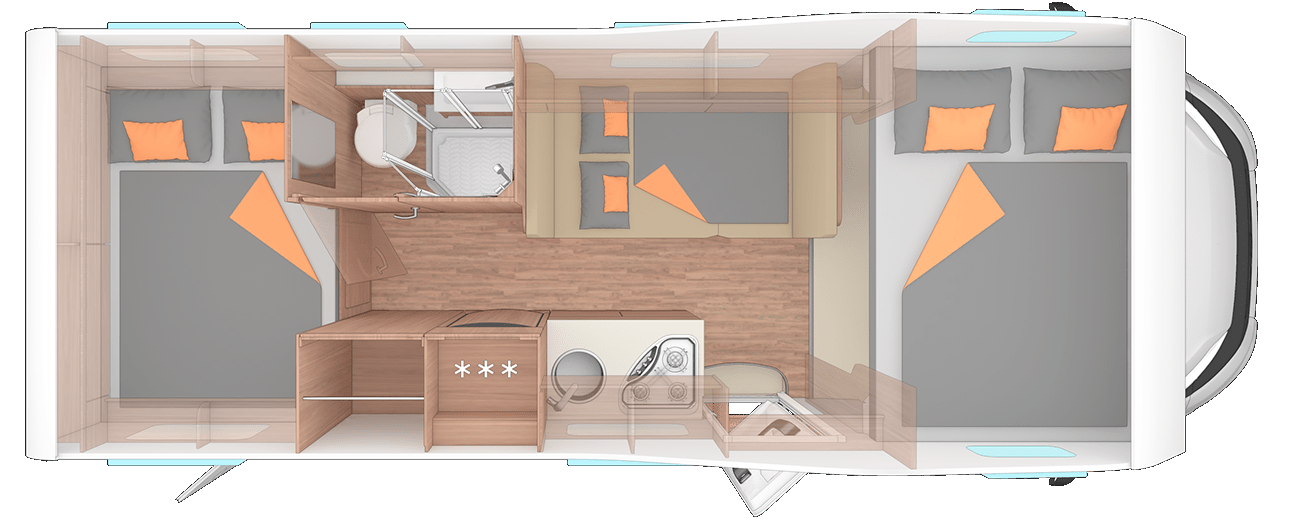 Bis zu drei separate Schlafbereiche: Der CaraHome bietet flexible Schlafmöglichkeiten für bis zu 6 Personen. Dazu zählen ein festes Doppelbett im Heck (210 x 141/135 cm), ein gemütliches Alkovenbett über dem Fahrerhaus (210 x 140 cm) und eine umbaufähige Sitzgruppe in der Mitte.
