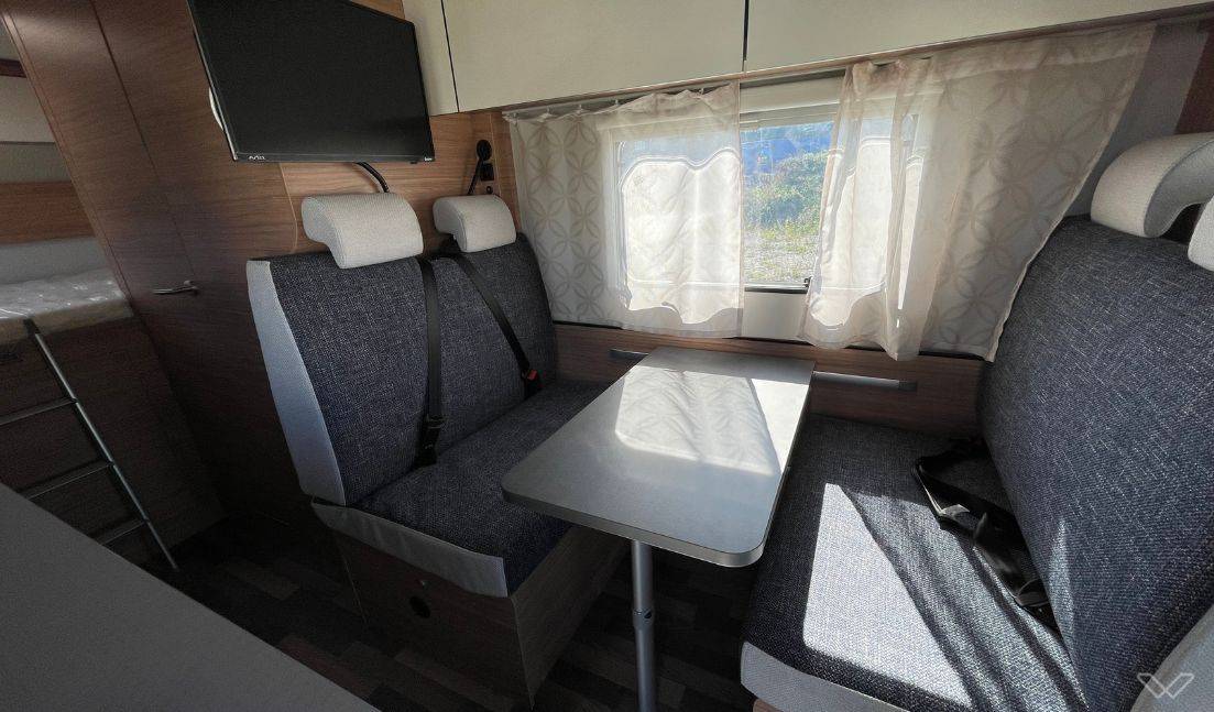 Flexible Sitzgruppe: Die Mittelsitzgruppe (Doppeldinette) mit ausziehbarer Tischplatte und drehbaren Fahrersitzen schafft einen gemütlichen Aufenthaltsbereich für alle.