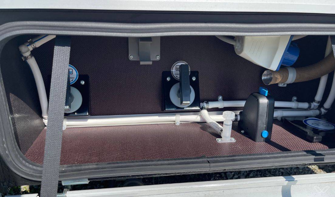 Große Heckgarage und Servicezugänge: Die beidseitig zugängliche Heckgarage (80 x 110 cm) bietet riesigen Stauraum. Alle Versorgungspunkte wie der Frischwassertank (124 Liter) und der Abwassertank (101 Liter) sind über praktische Serviceklappen mit Ein-Hand-Bedienung leicht erreichbar.